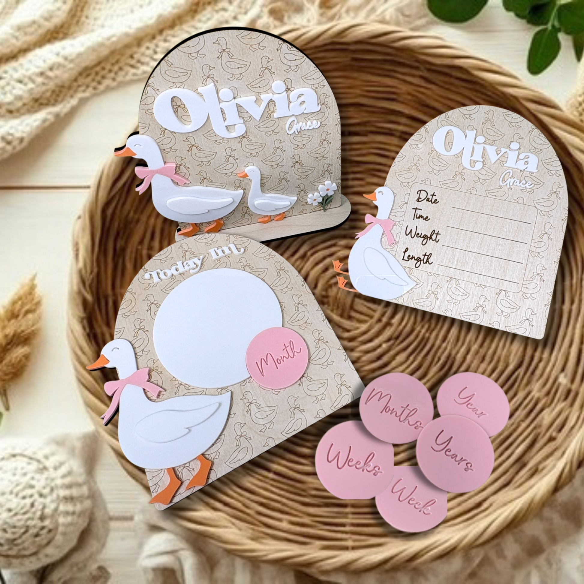 Capture the magic of your baby's birth with our personalised Goose set. Crafted from birch faced plywood with subtle geese engraving and choice of coloured acrylic. Perfect gift for new parents, baby showers, christenings, baptisms and birthdays or for announcing your loved one to family and friends or social media.